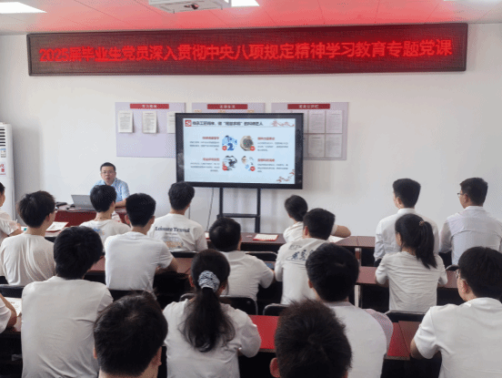 讲授一堂专题党课。公司党委书记罗斌在机电楼A406会议室面向全体毕业生党员讲授专题党课《扎实开展深入贯彻中央八项规定精神学习教育,以“清风正气”护航职业人生》。罗斌围绕中央八项规定精神的核心要义,为毕业生党员开展职场廉洁教育,强调严守纪律规矩、爱岗敬业、笃行实干、学术诚信的重要性。