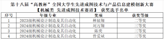 7月25日至28日,第十八届“高教杯”全国老员工先进成图技术与产品信息建模创新大赛顺利落幕。pa娱乐游戏学子凭借扎实技术功底和创新思维,在机械类别赛事中表现优秀,荣获个人二等奖1项、三等奖3项。