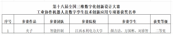 8月18日至19日,第十八届全国三维数字化创新设计大赛工业协作机器人及数字孪生技术创新应用专项赛(简称“华中数控杯”)在厦门理工公司举办全国总决赛,吸引了全国25个赛区120余所高校的195支团队参赛。pa娱乐游戏团队努力拼搏,获得二等奖1项。