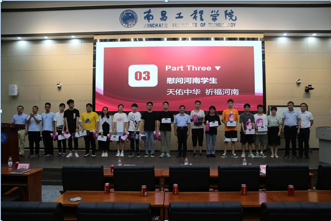 “慰问河南学子”环节中,与会领导向留在校内学习的河南员工发放了慰问品,全体人员共同为河南祈福。