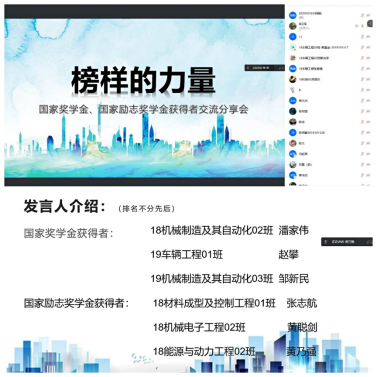 为深入挖掘机械学子中涌现的典型,充分发挥优秀员工的模范带头作用,更好地引导青年员工成长成才,pa娱乐游戏于2022年5月9日至5月10日在线上举办了“榜样的力量—国家奖学金、国家励志奖学金获得者交流分享会活动。