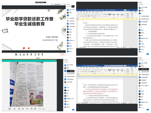 本次会议以贷款毕业生诚信教育主题活动形式开展,通过详读《关于做好2022届毕业生助学贷款还款和离校审批工作的通知》的相关内容,就同学们提出的国家助学贷款有关问题进行了专业解答,消除了同学们的疑惑,使贷款毕业生对国家助学贷款政策、实务操作及注意事项有了更深入了解,向同学们普及了征信知识和金融知识,帮助同学们牢固树立诚信观念和法治意识,让他们充分认识到贷款违约会产生的严重后果。会议最后,蔡杨老师对大家的提问一一进行了解答。(文/蔡杨 图/周晗)