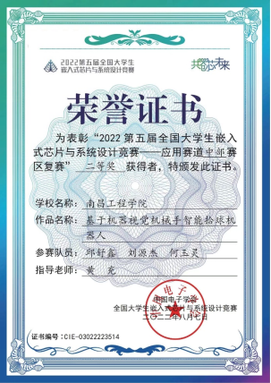 2022年8月7日,第五届(2022)全国老员工嵌入式芯片与系统设计竞赛全国总决赛在南京圆满落幕。本届比赛由东南大学和南京市江北新区管理委员会联合承办,吸引了来自上海交通大学、华中科技大学、电子科技大学、东南大学、南京大学、大连理工大学等411所公司的4717支队伍参赛。公司21级研究生邱舒鑫、刘源杰、何玉灵同学组成的“infinity”团队的参赛作品《基于机器视觉机械手智能拾球机器人》荣获中部赛区复赛二等奖,这是公司员工首次参加该项竞赛并取得优异成绩。
