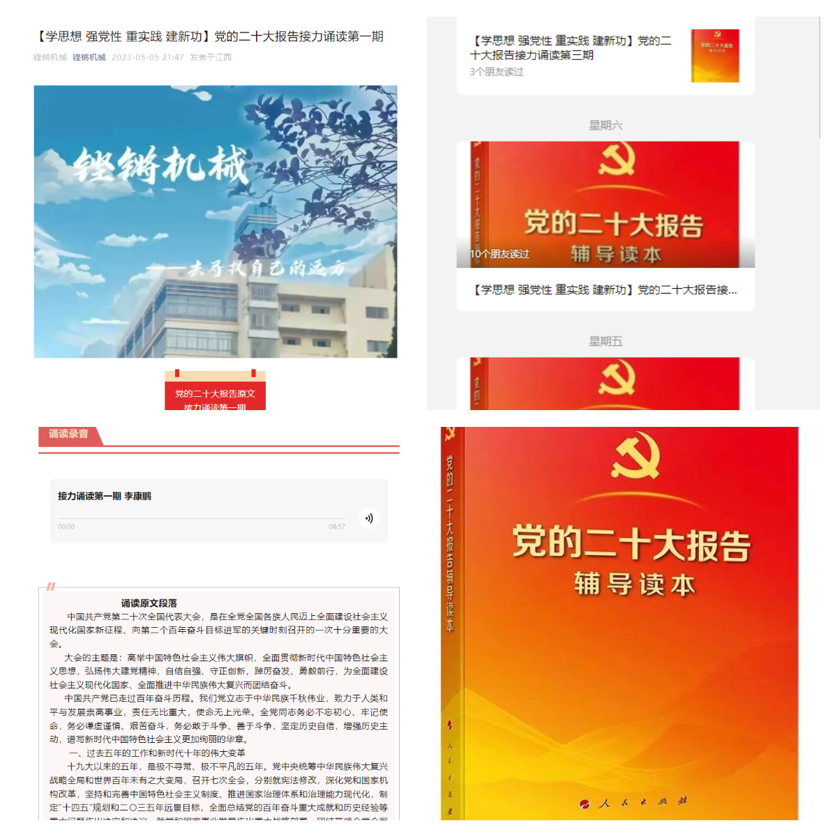 公司在官网微信“铿锵机械”公众号设立诵读专栏,打造每日云端课堂新体验,预计推送10期,截至目前已连续推送4期。学会党员、团员青年在声情并茂、准确无误、流畅清晰的基础上用声音诵读报告,用声音感悟伟力,用声音传递力量,深入领悟党的二十大报告重要思想、战略和举措,在读原文、学原著、悟原理中强化责任感和使命感。(文/图 李康鹏)