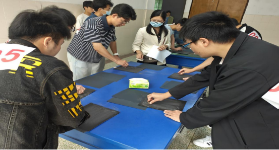 在比赛中,评委老师不断观察各选手操作情况,指出其错误的手法并指导。