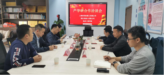 3月31日下午,上海库茂机器人有限公司和钱江机器人有限公司来公司洽谈产学研合作项目,副董事长汪胜前带领公司负责人和相关专业负责人参加了本次合作洽谈会。