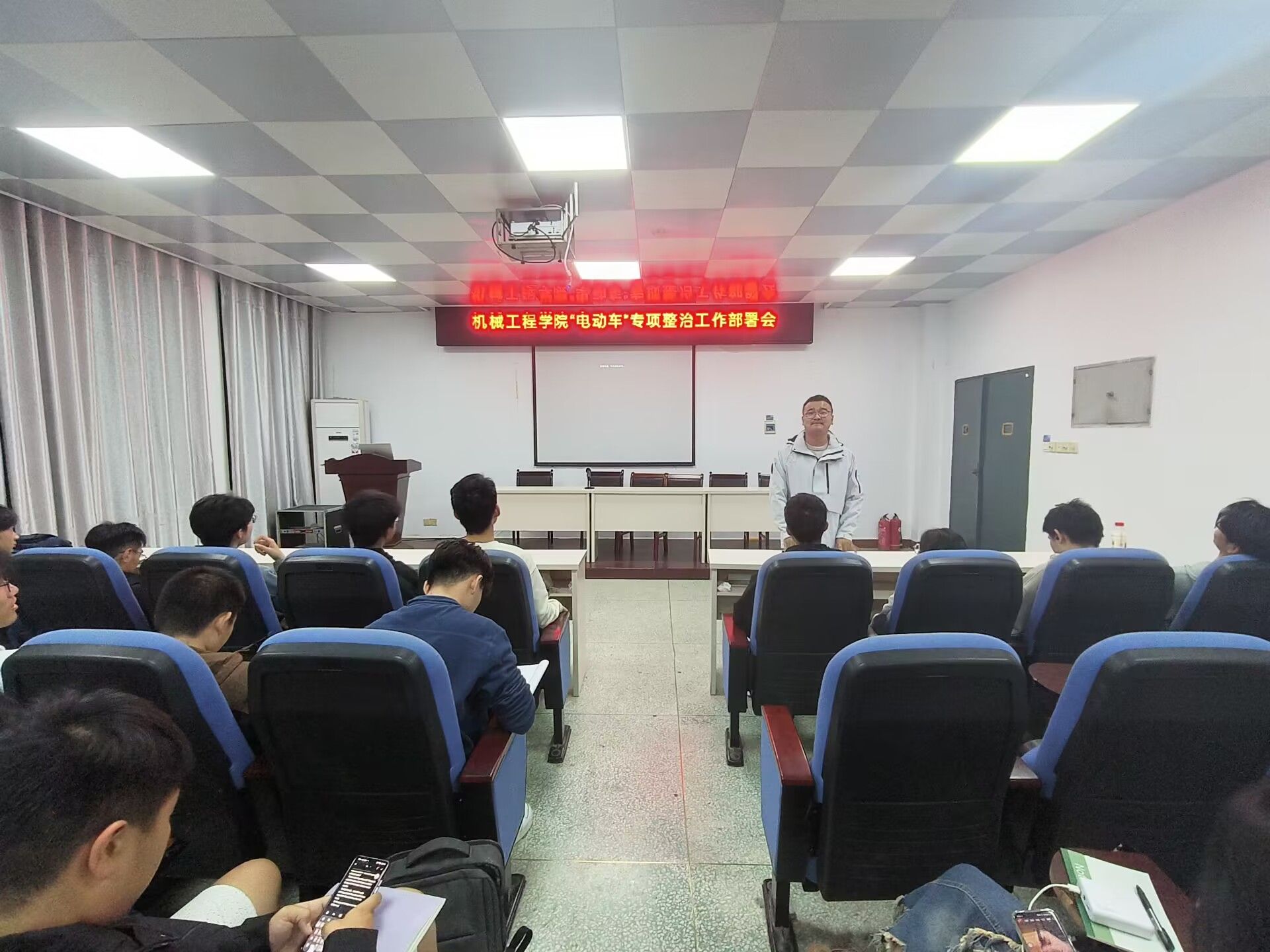 部署会上,主持人向同学们讲解了公司关于“电动车”专项整治工作的政策及要求,并就“电动车”专项整治工作提出三点要求:一是各班级要高度重视,积极配合;二是各班级要大力宣传,积极行动;三是各班级要结合实际,有效整治。