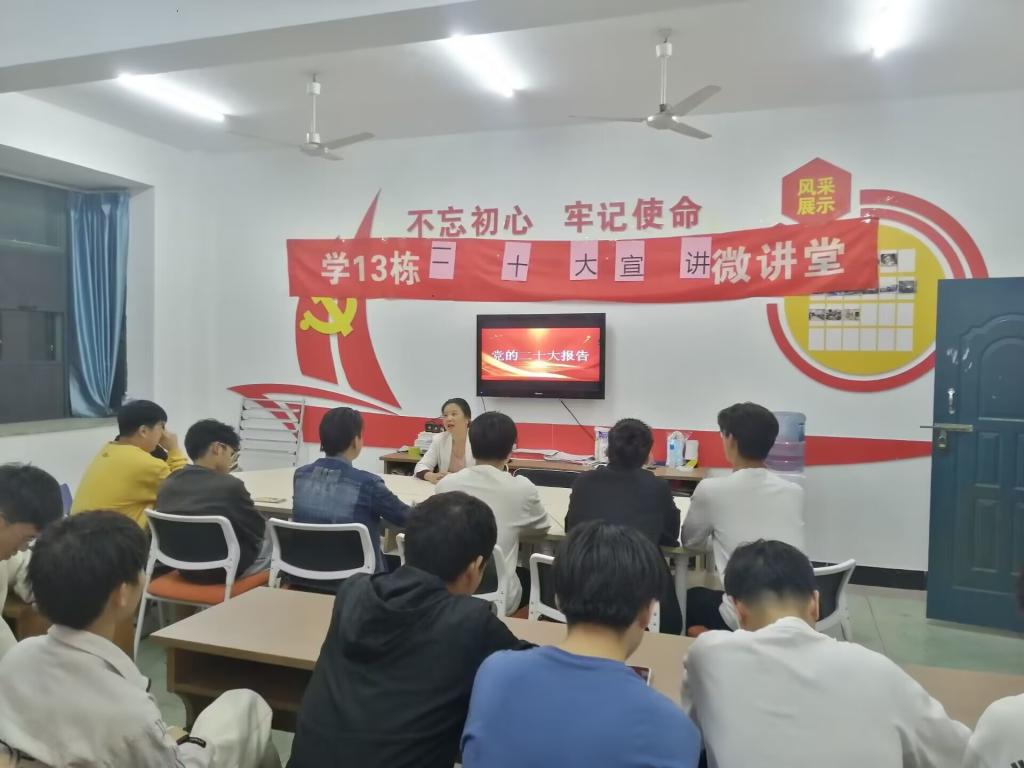 11月9日晚,公司学习贯彻党的二十大精神辅导员宣讲团成员、公司党委副书记张丽玲来到13栋新时代文明实践中心宣讲党的二十大精神,公司党员代表、团学干部代表、各班级代表共50余人聆听宣讲。